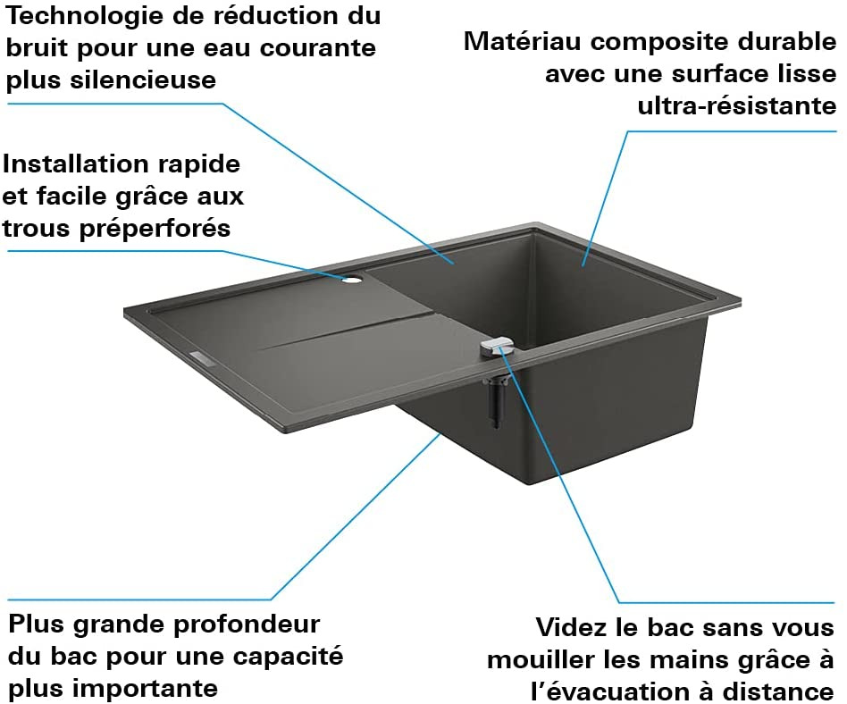 Caractéristiques de l'Evier en quartz composite avec égouttoir réversible 780x500 mm, Gris granite, Grohe K400 (G31639AT0-G) :