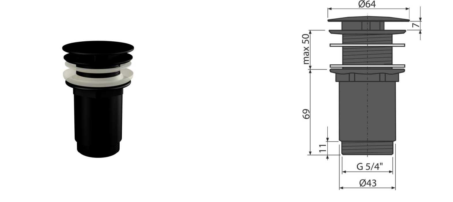 Alca Sortie lavabo 5/4 » tout métal, grand bouchon, pour lavabos sans débordement, noir mat (A396BLACK)