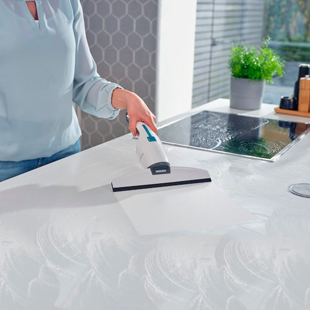 - Une buse spéciale pour salle de bains équipée d’une raclette blanche pour le nettoyage hygiénique des miroirs, des carreaux ou de la cabine de douche est disponible séparément