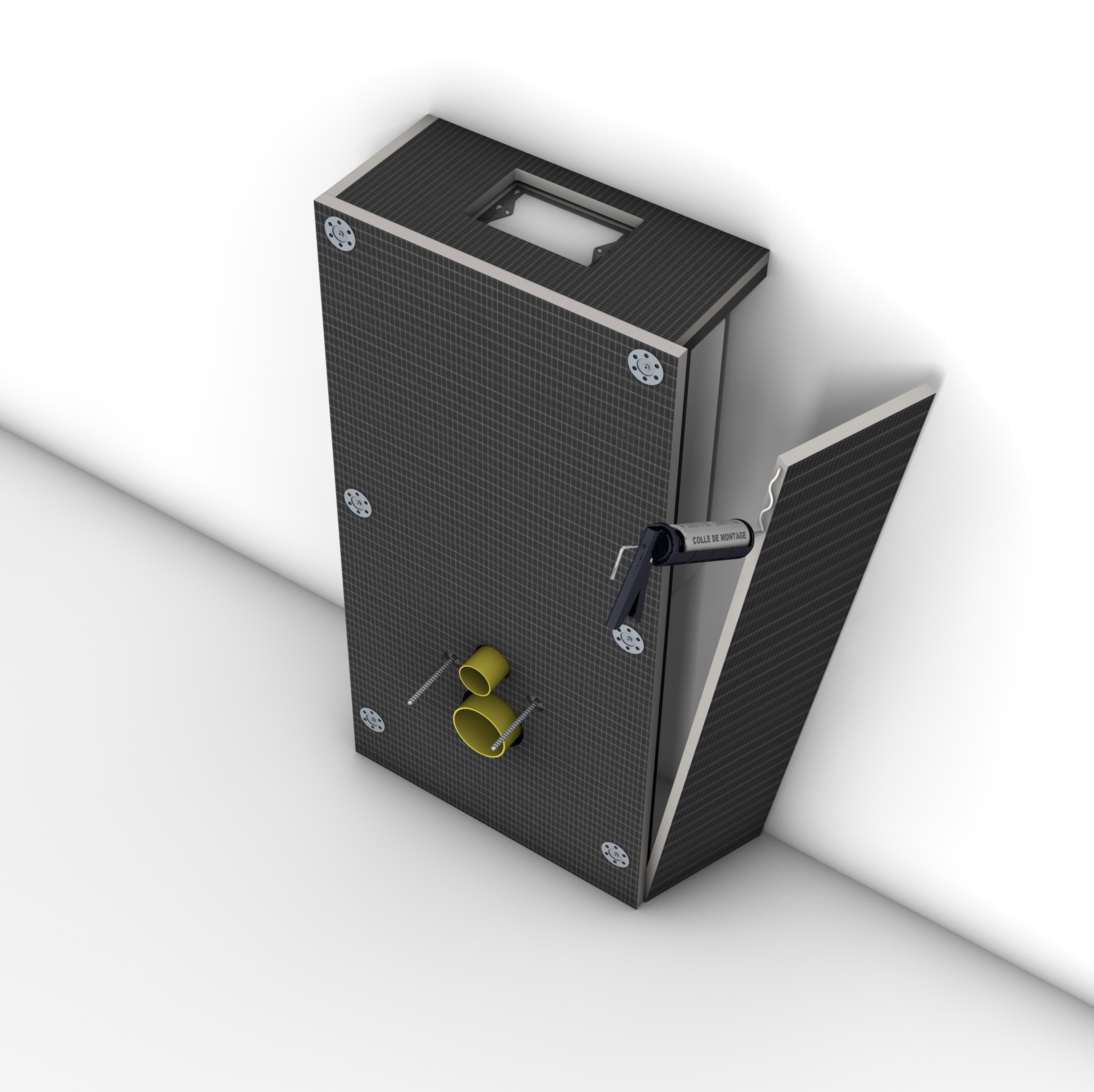 - Dimensions des panneaux : 1 panneau 1300 x 600 x 20 mm (avec découpes pour passage de canalisations) et 3 panneaux 1300 x 450 x 20 mm