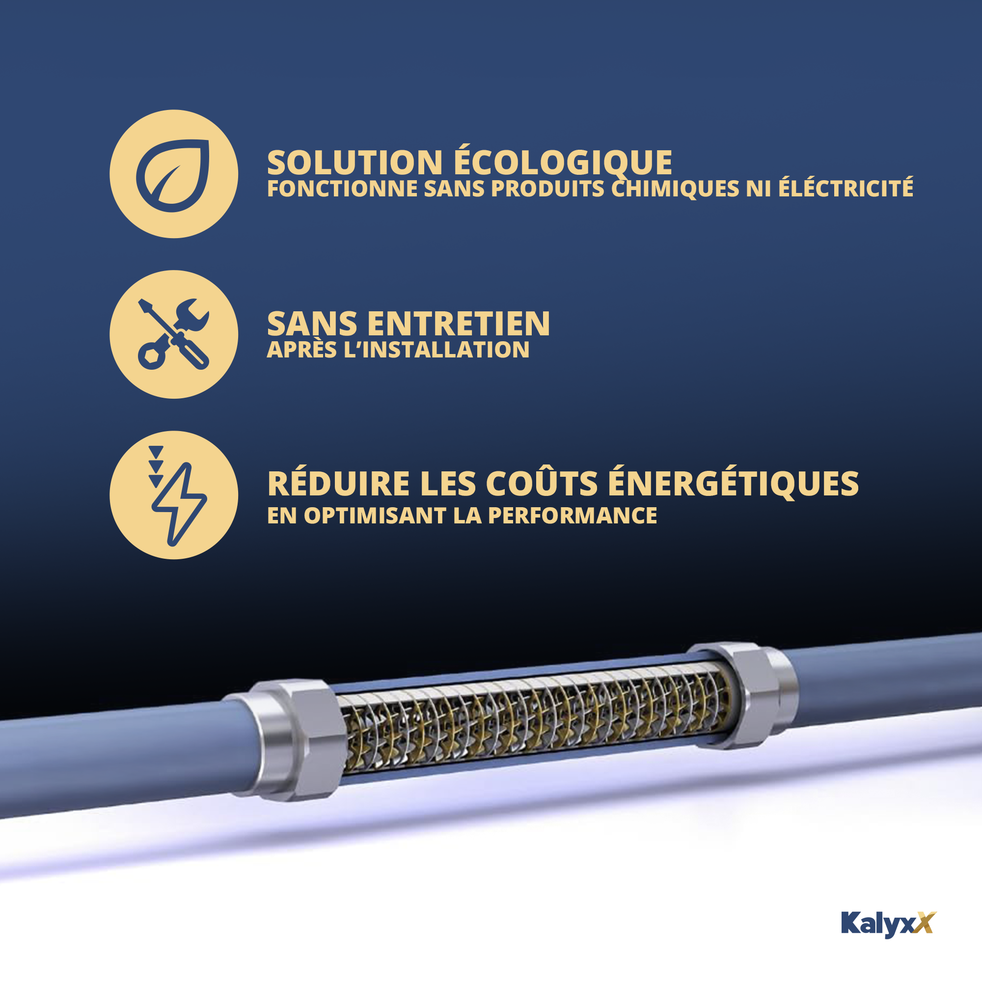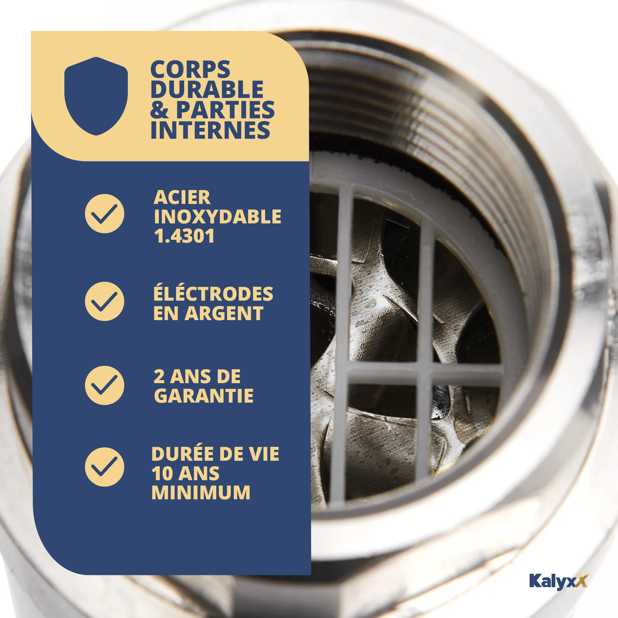 - Environnement : Contrairement aux adoucisseurs à sel qui produisent des eaux usées chargées en sodium, Kalyxx est sans produits chimiques et n'affecte pas la qualité des eaux rejetées.
