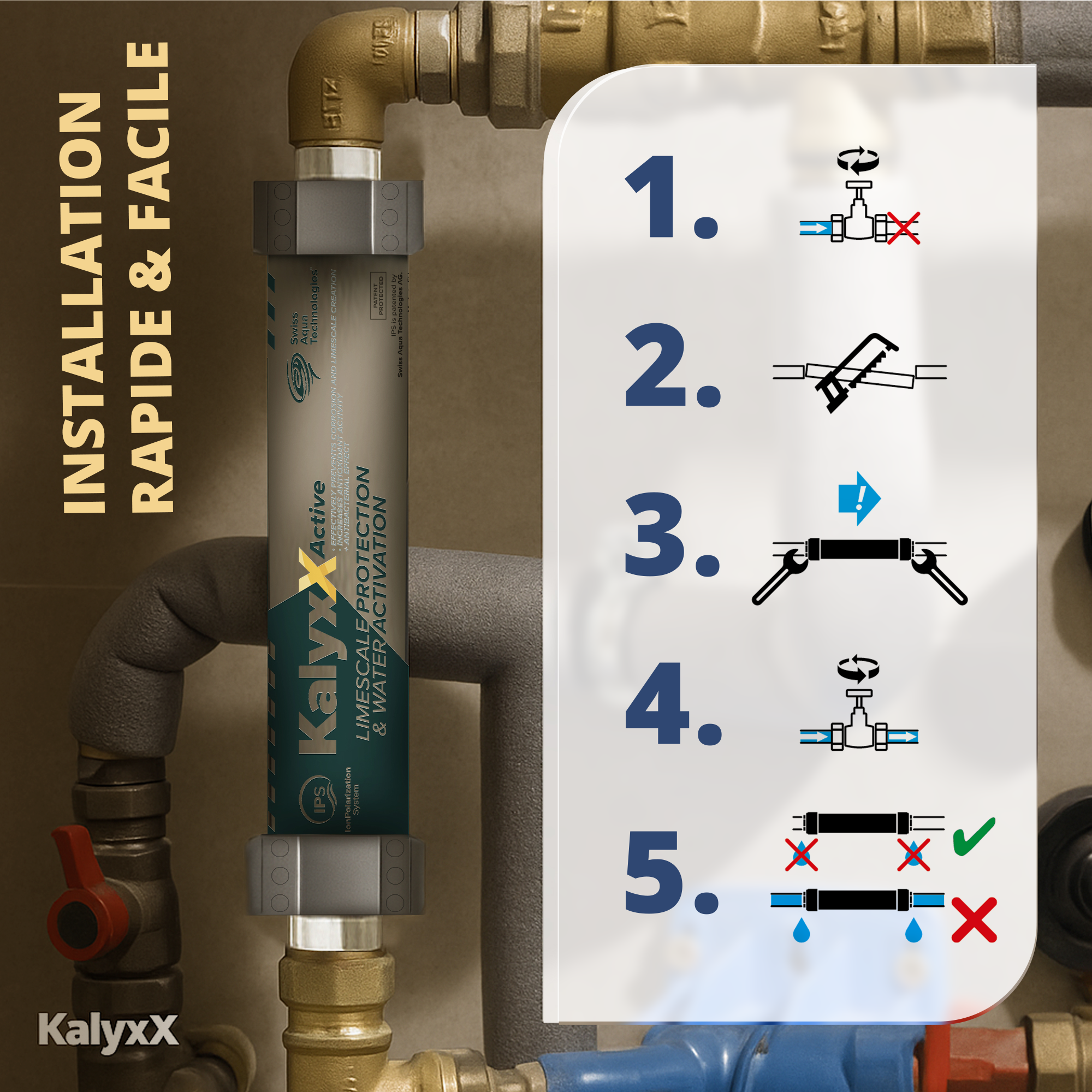 L'IPS Kalyxx est un adoucisseur d'eau innovant qui modifie la structure du calcaire en le transformant de calcite en aragonite, une forme non-adhérente qui ne s'accumule pas. Grâce à sa technologie brevetée de Polarisation Galvanique Turbulente (TGP), il empêche les dépôts et obstructions tout en préservant les minéraux bénéfiques pour la santé. Sans utiliser de produits chimiques ni nécessiter d'énergie externe, l'IPS Kalyxx offre une solution économique pour protéger vos équipements, vos canalisations et améliorer la qualité de l'eau.