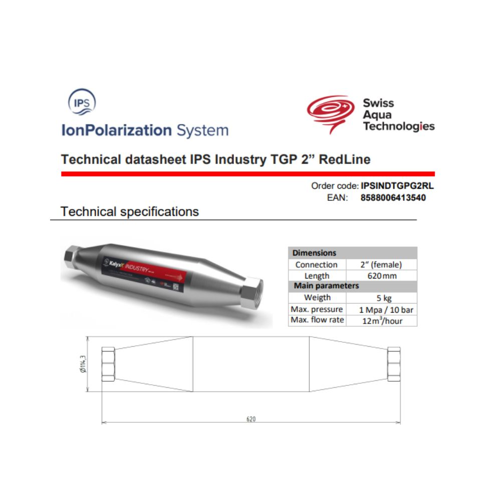 Caractéristiques de l'adoucisseur d'eau Industriel Anticalcaire Antibactérien innovant IPS Kalyxx RedLine DN50 Swiss Aqua Technologies (IPSINRDN50) :