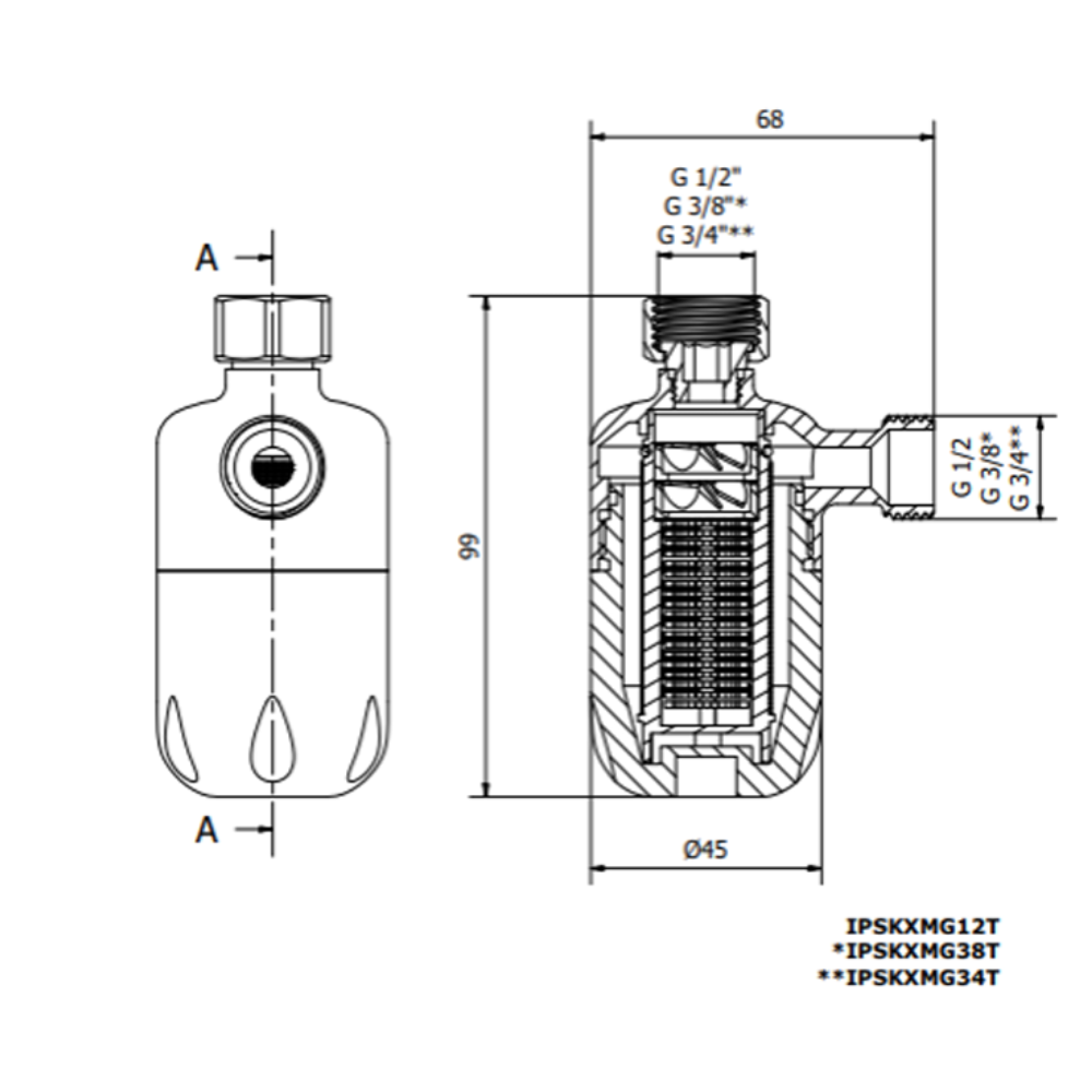 Options de raccordement : plusieurs tailles disponibles (ex. G 3/4" – IPSKXMG34T, G 1/2" – IPSKXMG12W).
