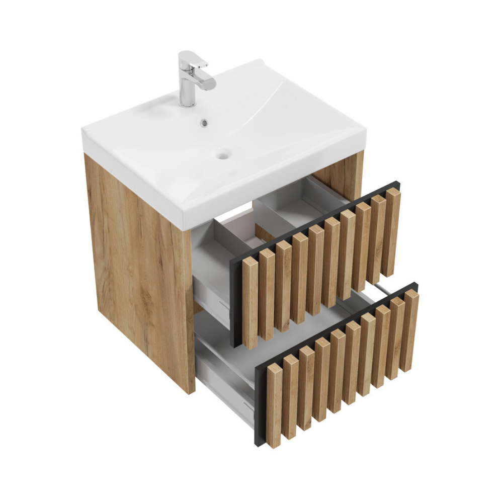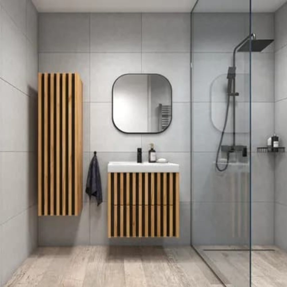 Avec ses dimensions de 60 × 56 × 45 cm, il offre un espace de rangement fonctionnel tout en conservant un format équilibré, adapté aux salles de bain de taille standard. La finition chêne mat apporte un rendu naturel et discret, facile à intégrer dans différents styles d’aménagement.