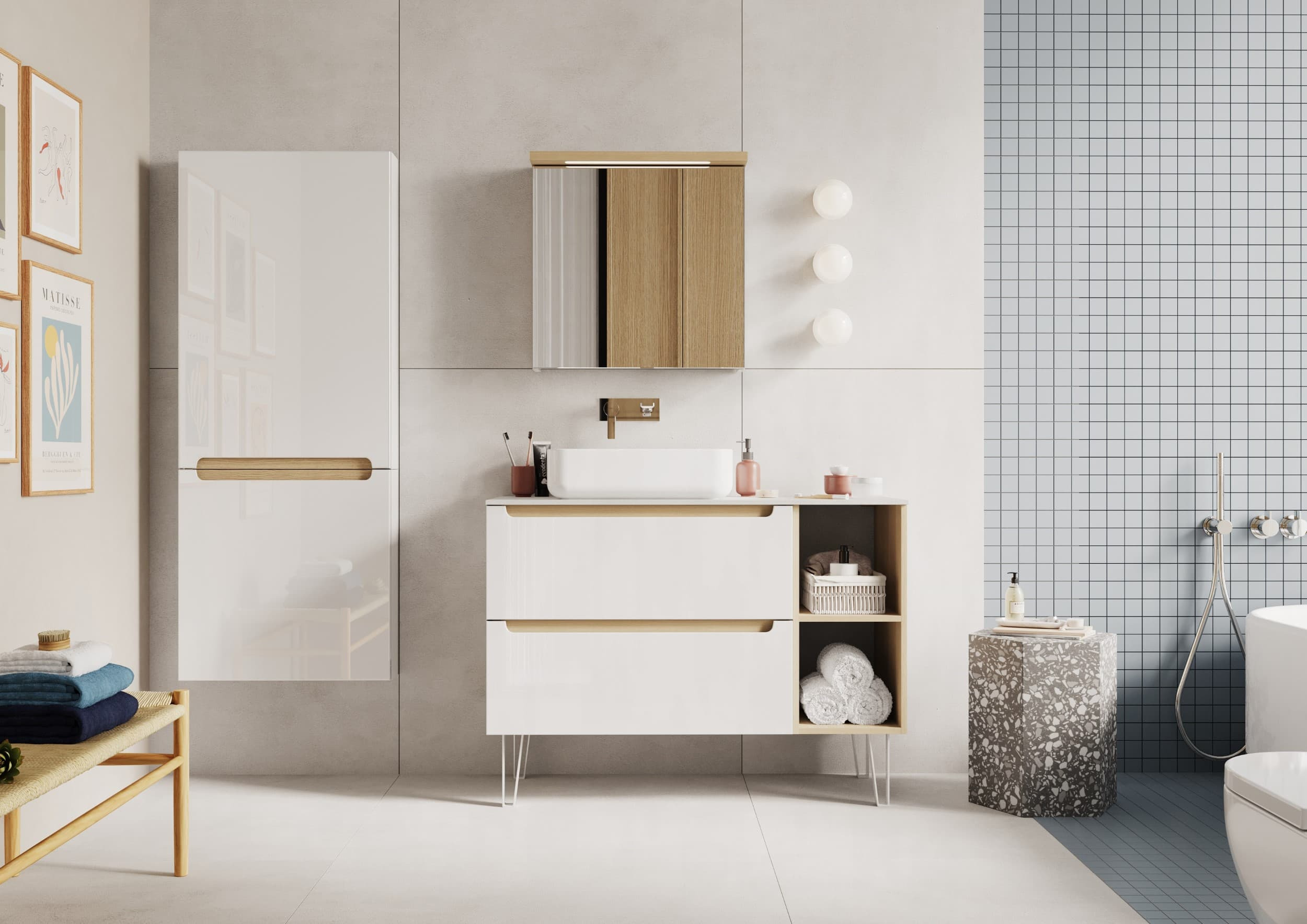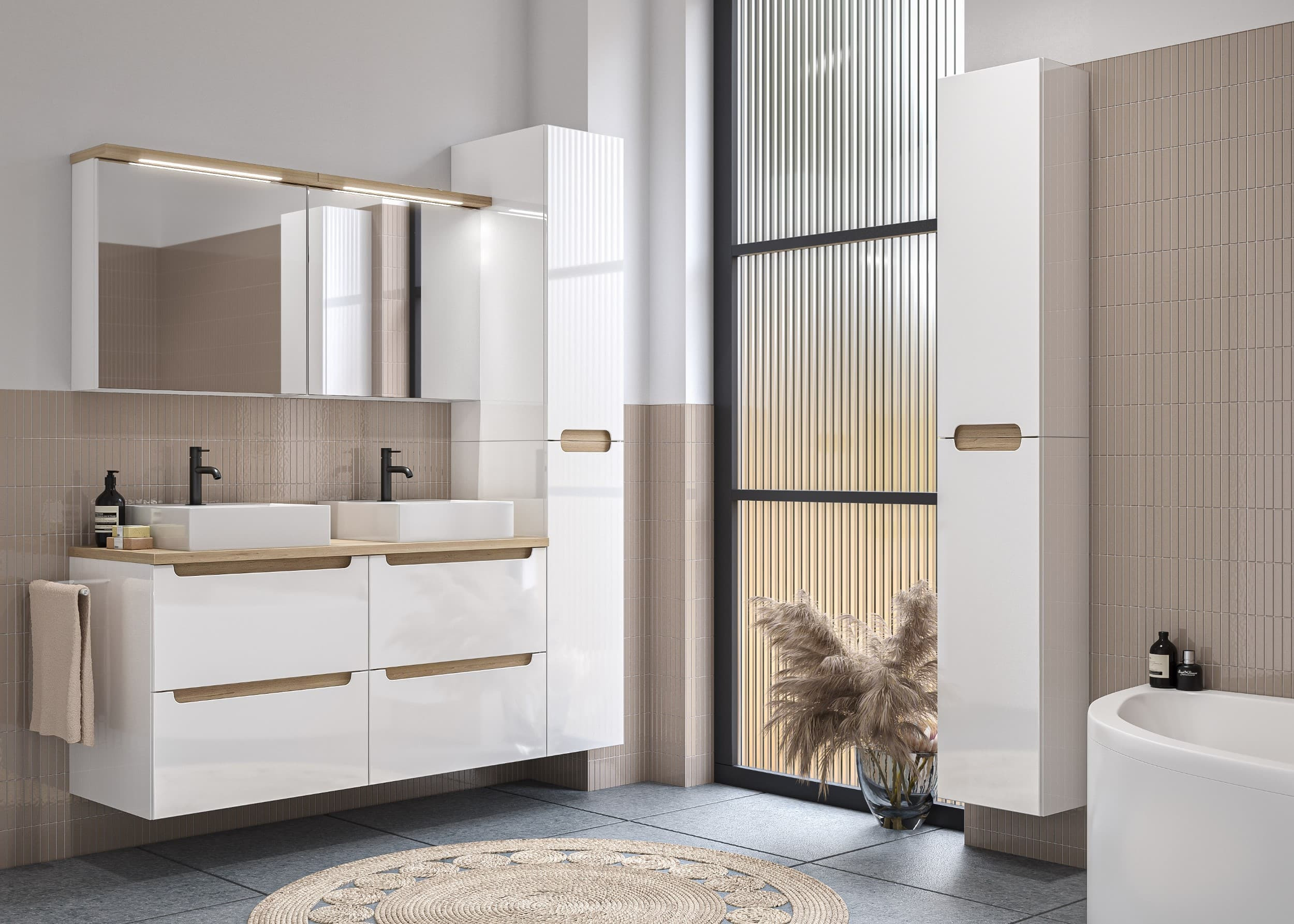 L'armoire murale mesurant 60 cm de large, 60 cm de haut et 20 cm de profondeur, est équipée d'un éclairage LED par le dessus avec protection IP44 contre les projections d'eau, et d'une prise 220V à l'intérieur de l'armoir pour y brancher par exemple un sèche-cheveux ou un rasoir électrique.