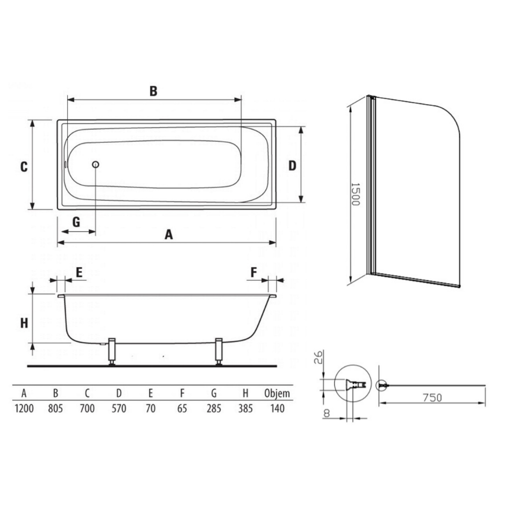 Contenu de l'ensemble ensemble baignoire 120x70 cm Riga universelle + Pare baignoire pivotant chrome + pieds (3402-SETP):