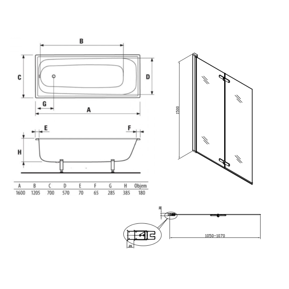 Contenu de l'ensemble baignoire 160x70 cm Riga universelle + Pare baignoire pivotant chrome + pieds (3406-SETP):