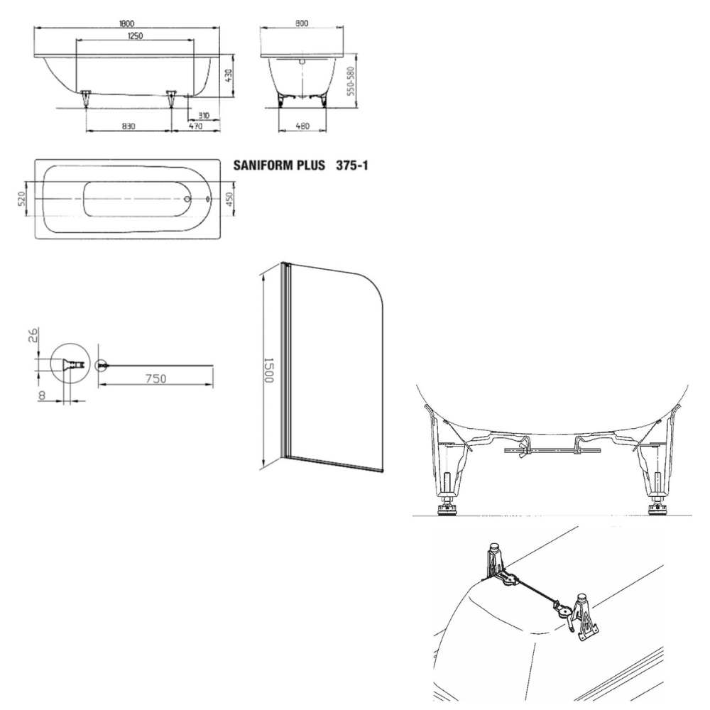 Kaldewei 180x80 cm Ensemble baignoire Saniform universelle + Pare baignoire pivotant chrome + pieds ( KW3751-SETP1)