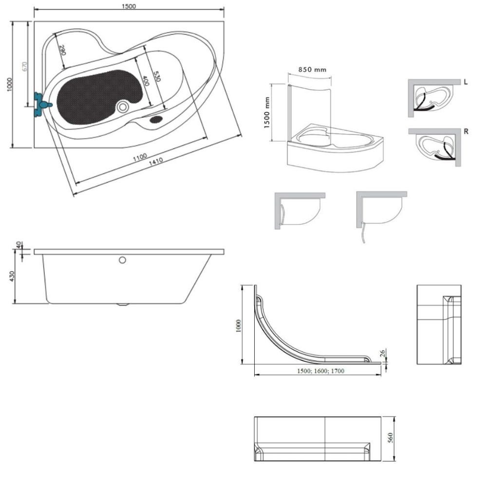 Caractéristiques de la baignoire asymétrique en acrylique, 150x100 cm, gauche + tablier 150 cm + pare-baignoire + pieds, Siko Laguna Fortuna Plus, blanc (FO1500LPLUS-SETP1) :