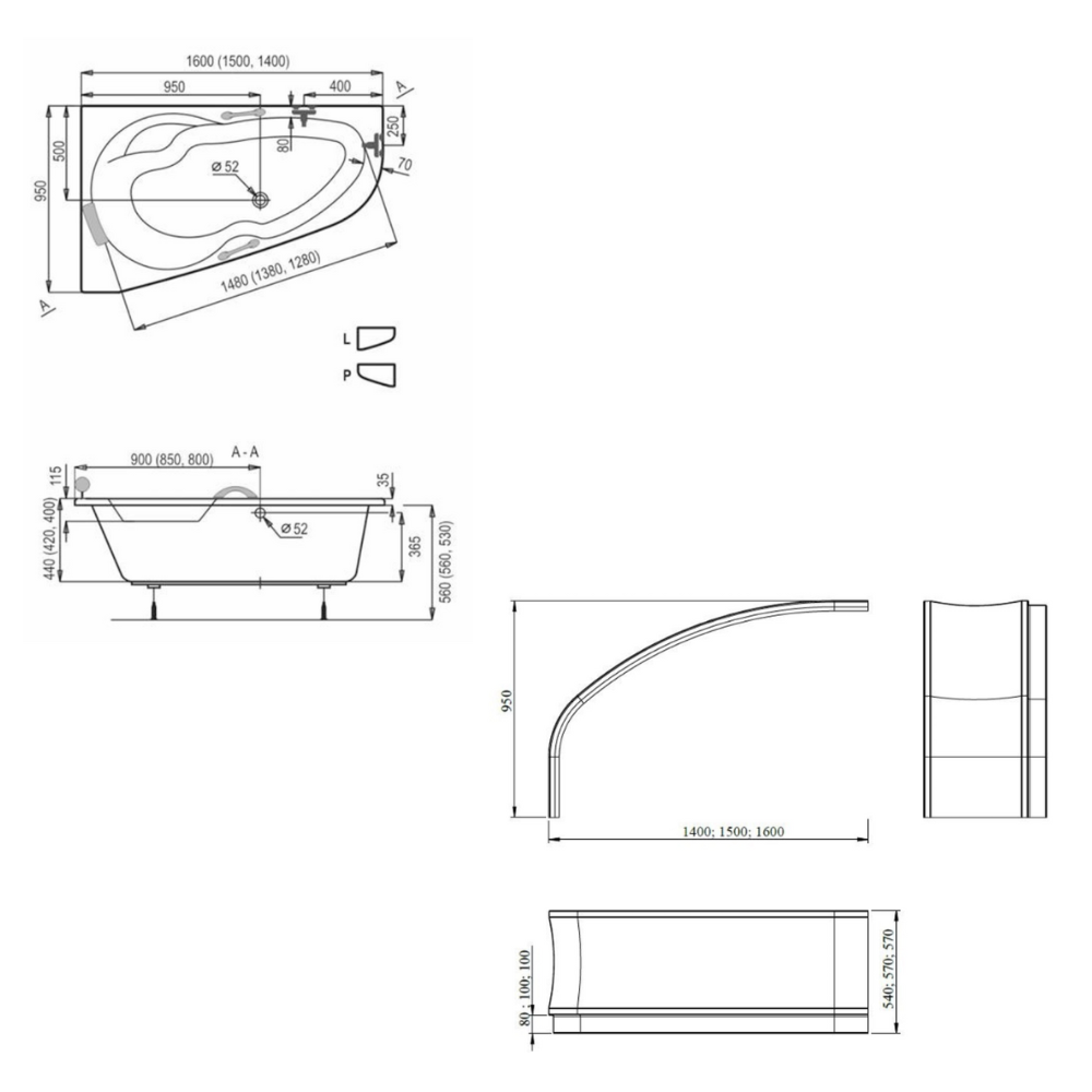Caractéristiques de la baignoire d'angle en acrylique, 160x95 cm, gauche + tablier 160 cm + pieds, Siko Laguna Luiza, blanc (LU1600L-SET1) :