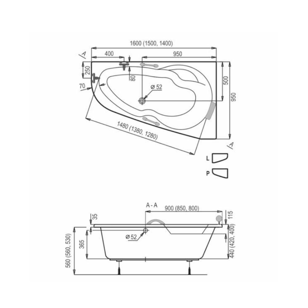Caractéristiques de la baignoire asymétrique avec pieds Siko Laguna Luiza, 150x95 cm, acrylique, droite, blanc (LU1500P-SET) :