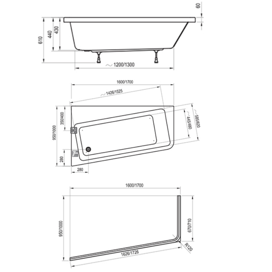Caractéristiques de la Baignoire asymétrique 160x95cm, orientation droite, Acrylique, Blanc, Ravak 10° (C841000000) :