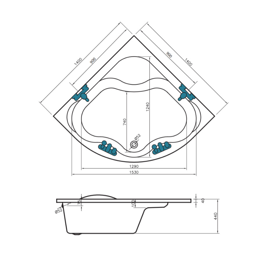Caractéristiques de la Baignoire d'angle 140x140cm acrylique, Blanc, Siko Laguna Samanta Plus (SM1400PLUS) :