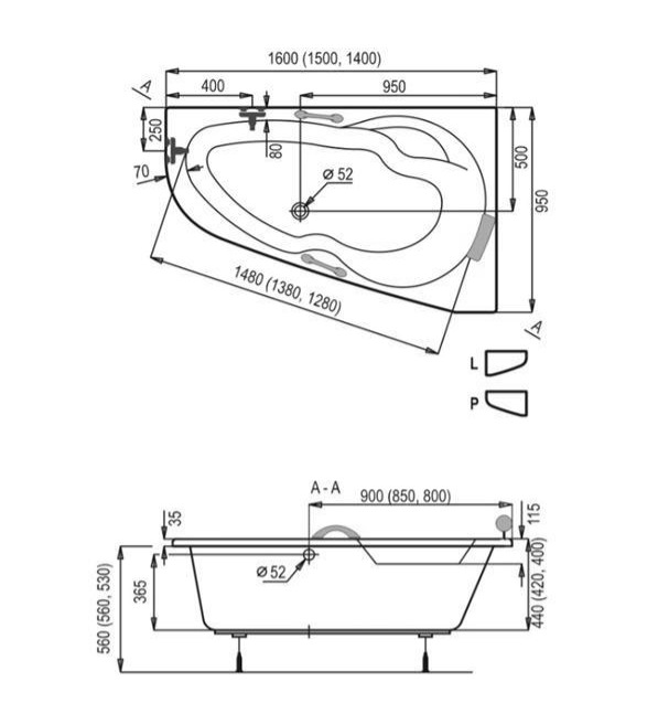 Siko 140 x 95 cm Luiza baignoire d'angle gain de place, orientation droite en acrylique, sans pieds, blanc (LU1400P)