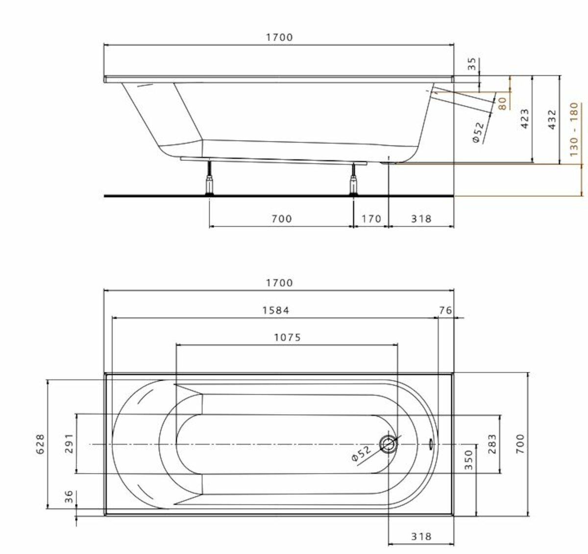 Caractéristiques de la Baignoire rectangulaire 190 L, 170x70cm, orientation droite et gauche, en acrylique, pieds compris, KOLO By Geberit Opal Plus (XWP1270000) :
