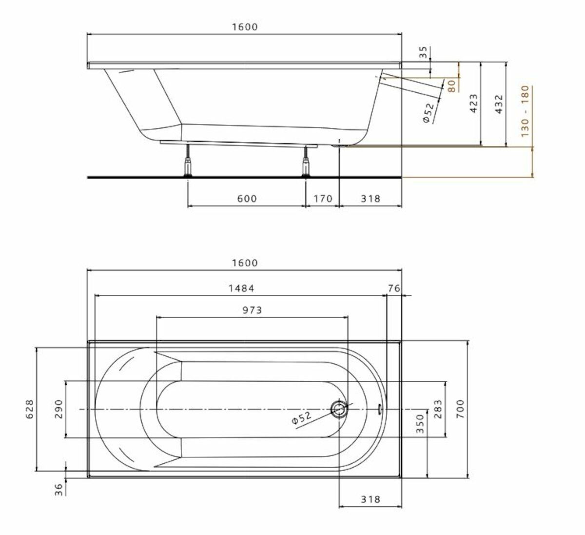 Caractéristiques de la Baignoire rectangulaire 180 L, 160x70cm, orientation droite et gauche, en acrylique, pieds compris, KOBO By Geberit Opal Plus (XWP1260000) :