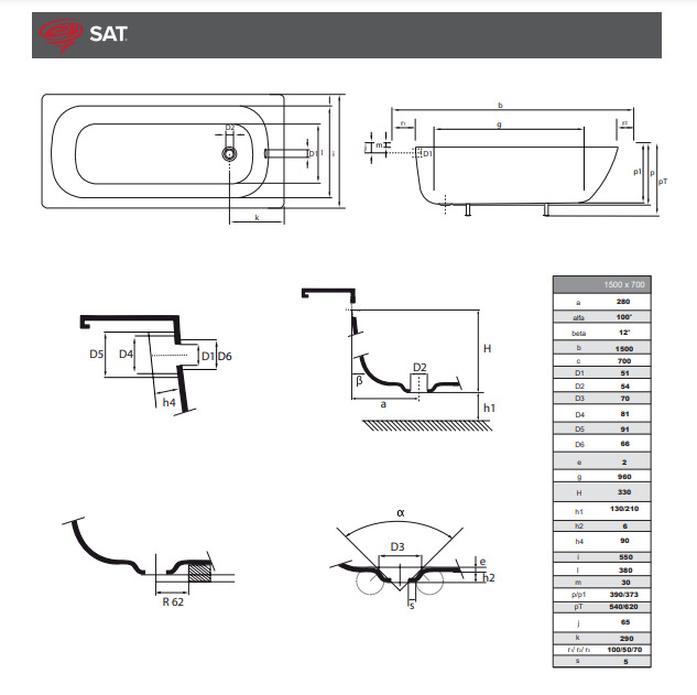 Caractéristiques de la Baignoire droite 150x70x39, en acier émaillé, Swiss Aqua Technologies Project, Blanc (SATVPRO150) :