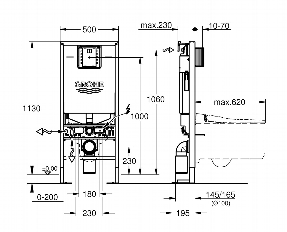 Grohe Rapid SLX Bâti-support autoportant pour WC lavant, Hauteur d'installation 1,13m avec Prise de courant intégrée (39599000)