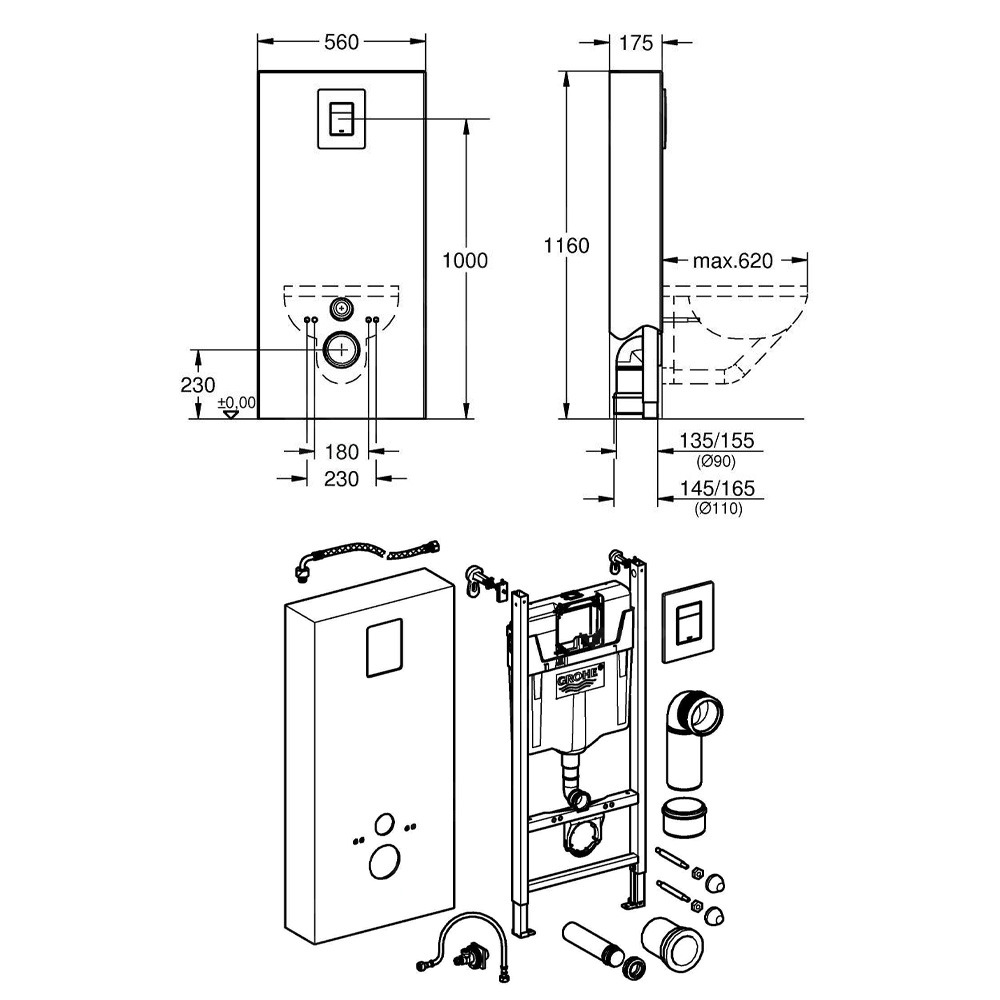 Grohe SOLIDO MONOBLOC Bâti-support classique 560x1160 mm, habillage blanc, plaque de commande chrome (39377LS0)