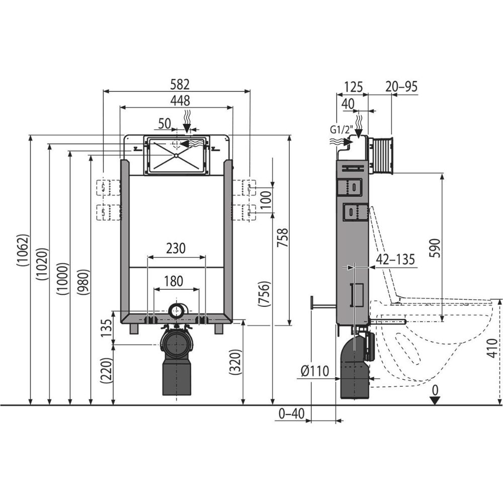 - Compatible avec les cuvettes suspendues ayant un entraxe de fixation de 180 mm ou 230 mm