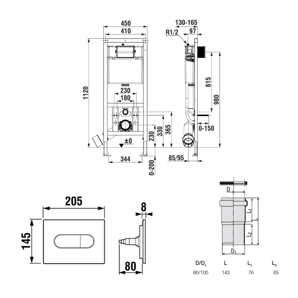 Bâti-support encastrable pour WC suspendu, installation sur cloison légère, hauteur 112 cm, chasse 2/4-6 L (A8900200Z0) :