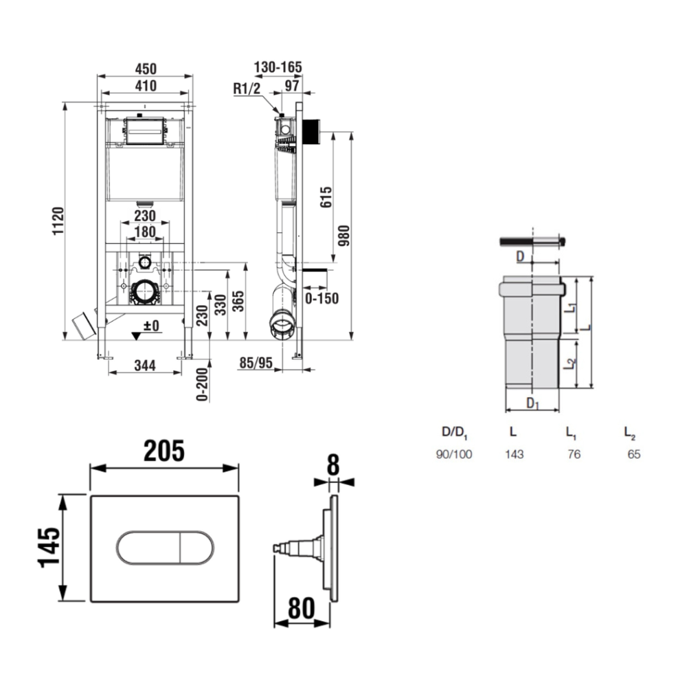 Caractéristisques du bâti-support encastrable pour WC suspendu, installation sur cloison légère, hauteur 112 cm, chasse 2/4-6 L + plaque noir mat (ROB01-FR) :