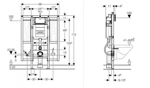- Hauteur de montage du WC réglable dans la phase du gros-œuvre, 41–46 cm