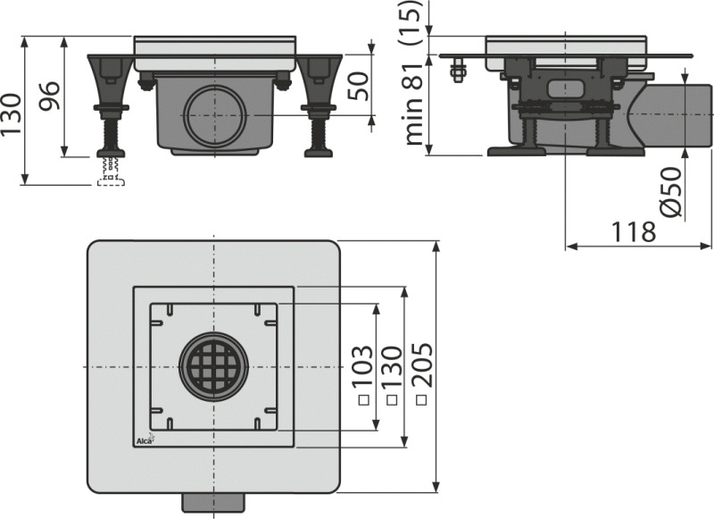 Alca Siphon de sol en acier inoxydable sans grille 130x130mm, piège les mauvaises odeurs