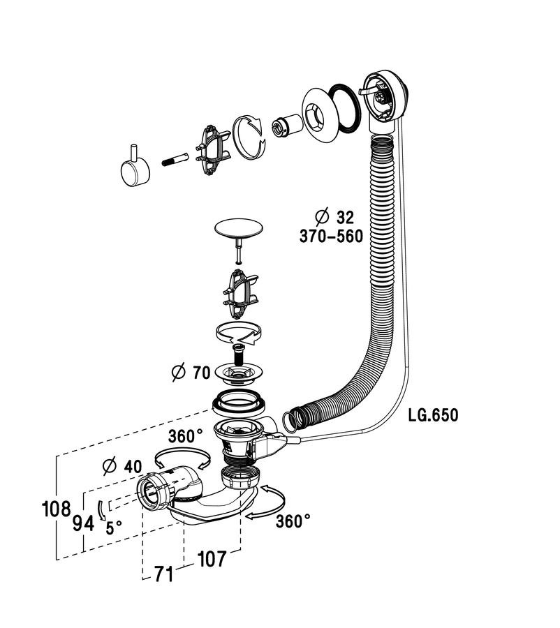 Caractéristiques du Vidage baignoire avec câble 65cm, Débit de 70l/min, Rotule orientable à 360°, Ajustable en hauteur, Nicoll Easybain (0203613) :