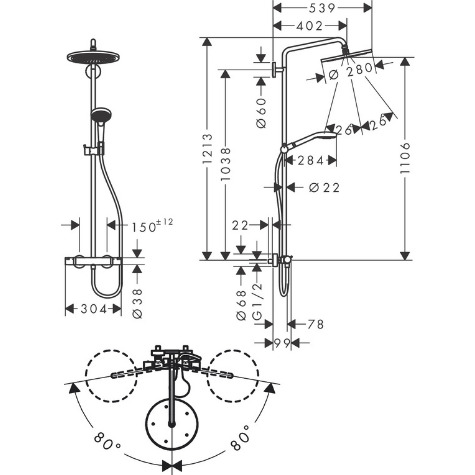Caractéristiques de la Colonne de douche 280 1jet EcoSmart 9l/min avec mitigeur thermostatique Croma Select S, noir mat (26891670) :