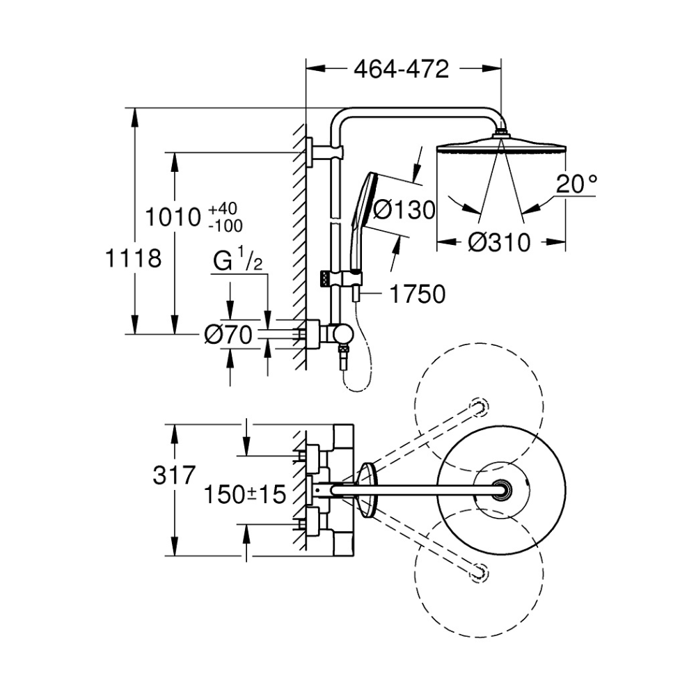 Caractéristiques de la colonne de douche avec mitigeur thermostatique, chrome Grohe Rainshower SmartActive 310 (G26647000) :