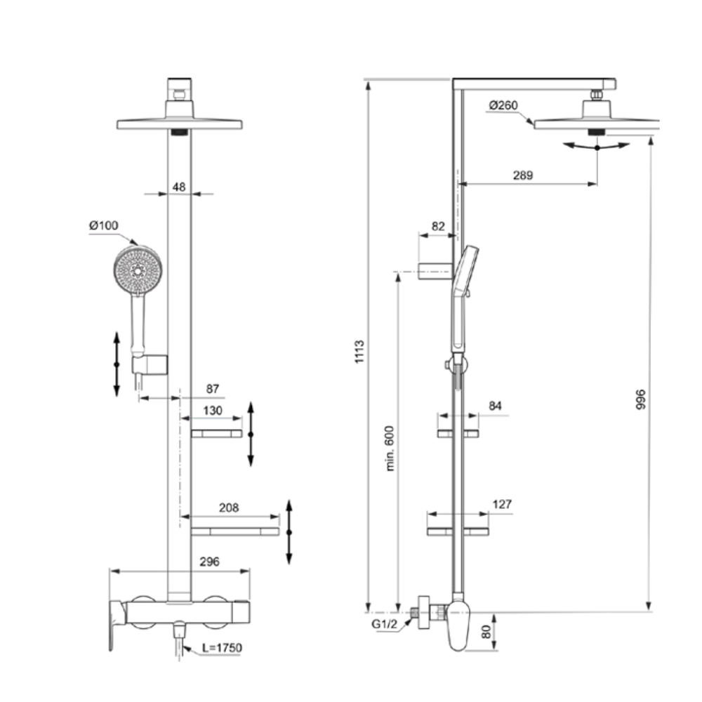Caractéristiques du système de douche 2 jets, hauteur 111,3 cm avec tablette, Ideal Standard Alu+ , rose (BD584RO) :