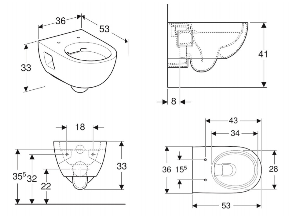 Caractéristiques de la Cuvette suspendue sans bride en céramique blanche, Geberit Selnova (501.545.01.1) :