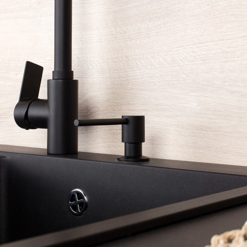 Distributeur de savon ou de détergent encastré en noir. La pompe est en laiton. Pour remplir le distributeur de savon ou de détergent, il suffit de retirer la pompe du distributeur et de la remettre en place, sans avoir à visser quoi que ce soit. Montage par perçage.