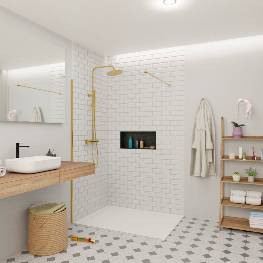 Caractéristiques de la paroi de douche Walk-In anticalcaire avec profilés et bras couleur Or (SATBWI130PRZ) :