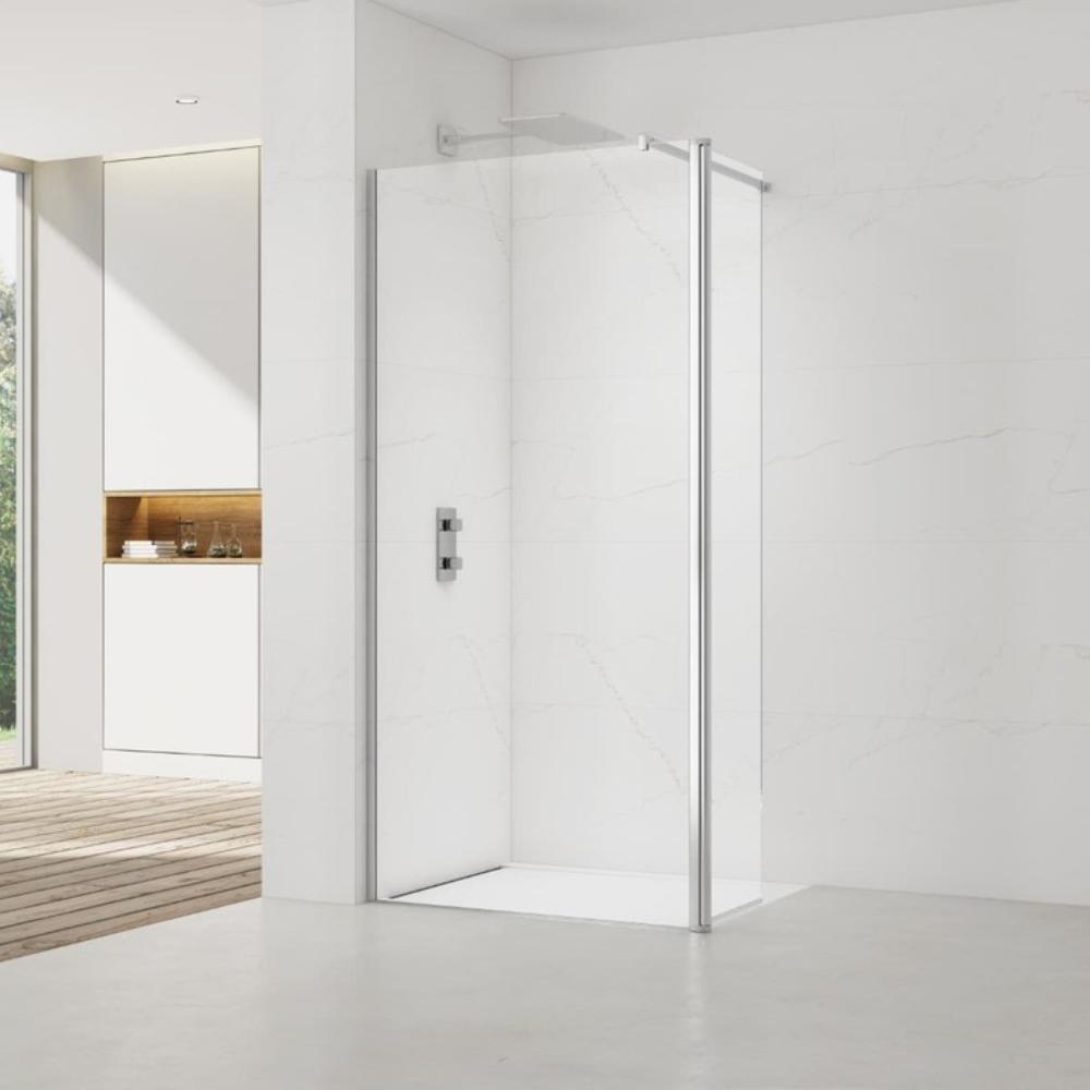 Cette paroi de douche de 100 cm et son retour, en verre Crystal Glass® de 8 mm d’épaisseur avec traitement anticalcaire, combine esthétisme et praticité. Le design épuré est sublimé par des profilés et un bras de fixation en chrome brillant, ajoutant une touche de modernité et de luxe à votre espace. Idéale pour une douche à l'italienne, il créer une sensation d'espace et de luminosité, tout en garantissant une transparence durable grâce au traitement anticalcaire et à la qualité remarquable du verre Crystal Glass®.