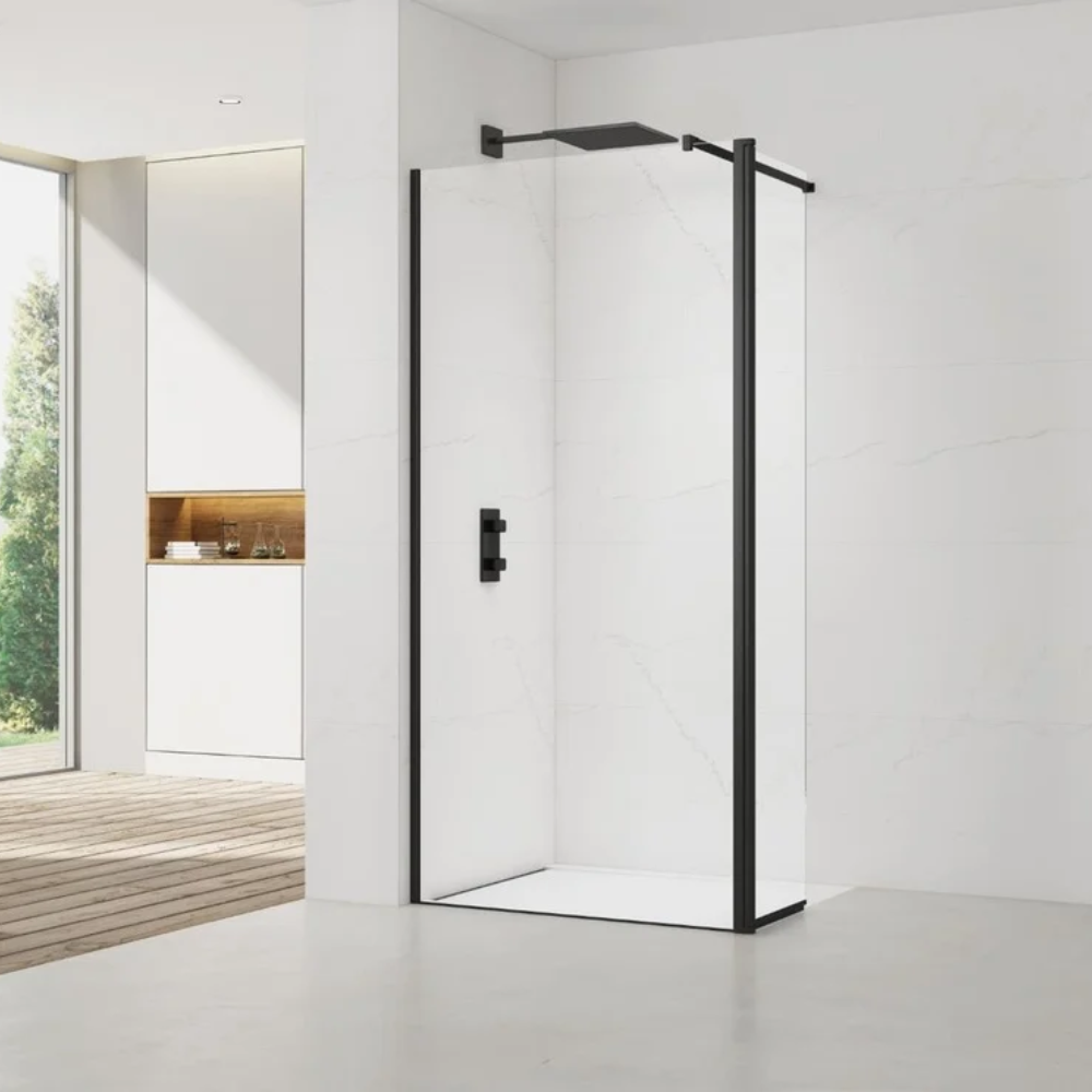 Cette paroi de douche de 110 cm et son retour , en verre Crystal Glass® de 8 mm d’épaisseur avec traitement anticalcaire, combine esthétisme et praticité. Le design épuré est sublimé par des profilés et un bras de fixation noir mat, ajoutant une touche de modernité et de luxe à votre espace. Idéale pour une douche à l'italienne, il créer une sensation d'espace et de luminosité, tout en garantissant une transparence durable grâce au traitement anticalcaire et à la qualité remarquable du verre Crystal Glass®.