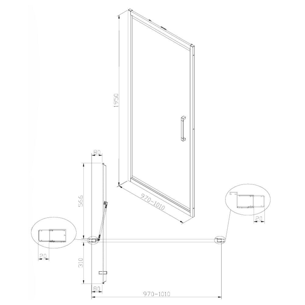 - Verre trempé de sécurité de 6 mm porte et paroi