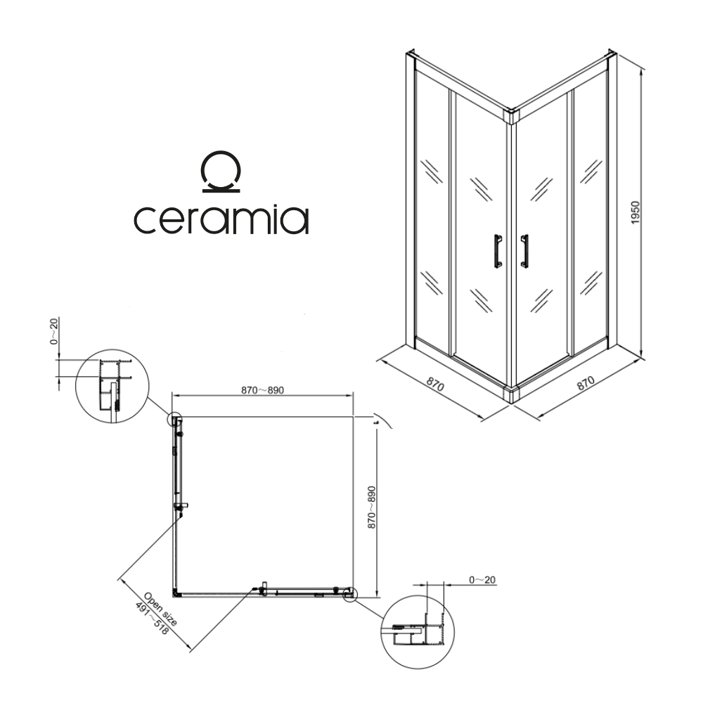 Caractéristiques de la porte de douche CASCADA 90X90x195cm coulissante avec profilés Noir mat (CERAHC9090B) :