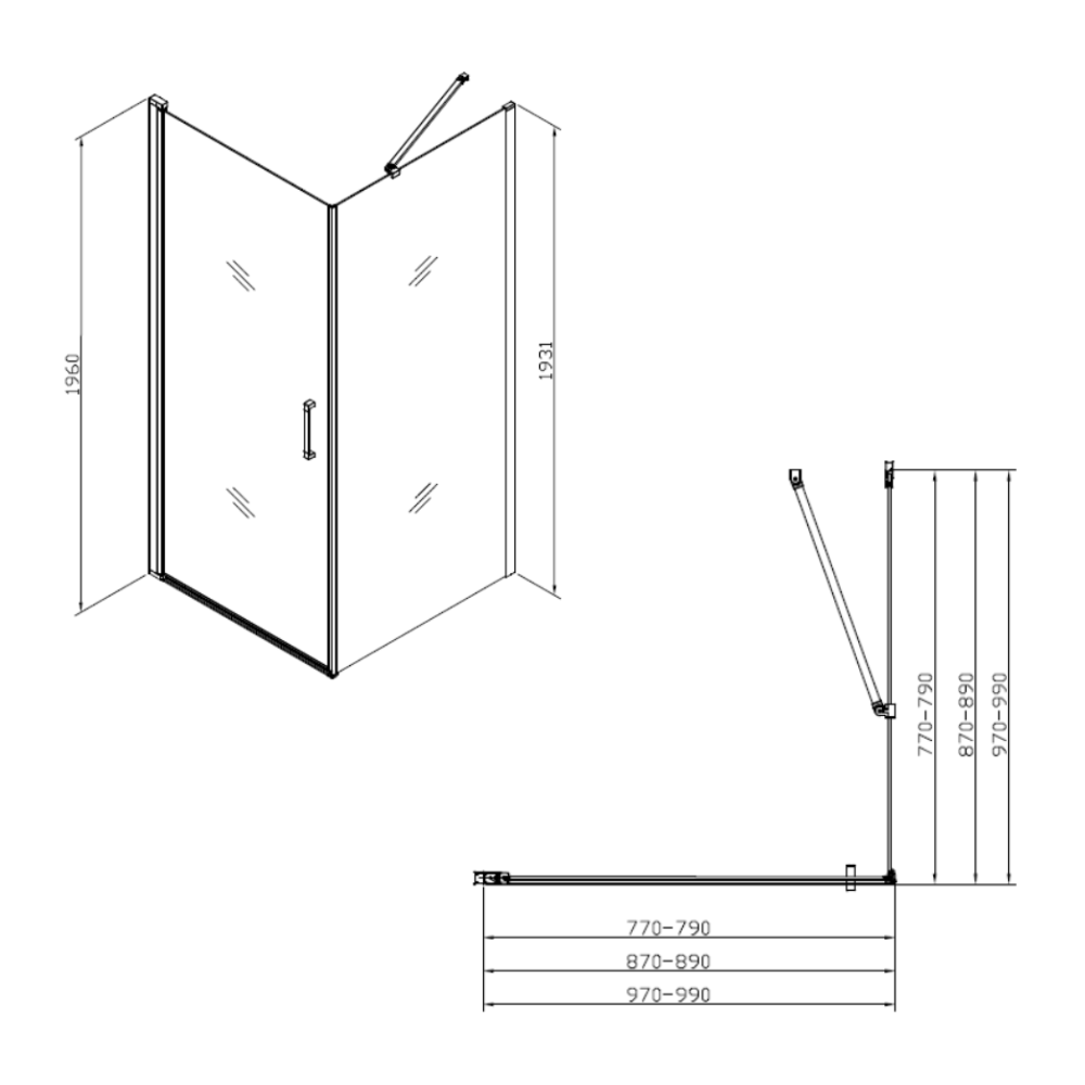 Caractéristiques de l'ensemble porte pivotante/paroi 90x90cm FUSION anticalcaire avec profilés chrome brillant (SATFUD90S90-SET) :