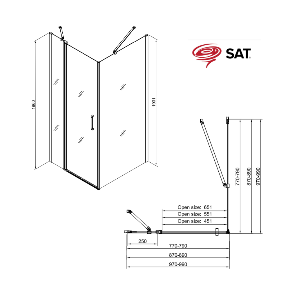 Caractéristiques de l'ensemble porte pivotante/paroi 100x100cm FUSION anticalcaire avec profilés chrome brillant (SATFUDP100S100-SET) :