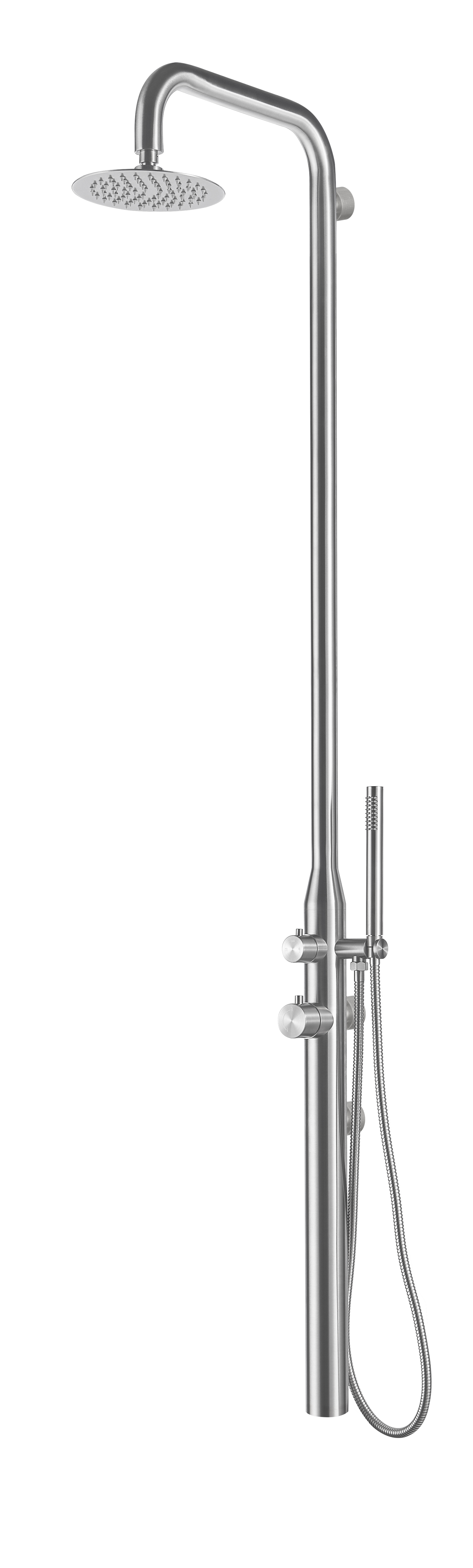 Caractéristiques de la douche extérieure de jardin et piscine, acier inoxydable 316, eau chaude et froide, douchette à main, acier brossé (NATUREL-IN09)