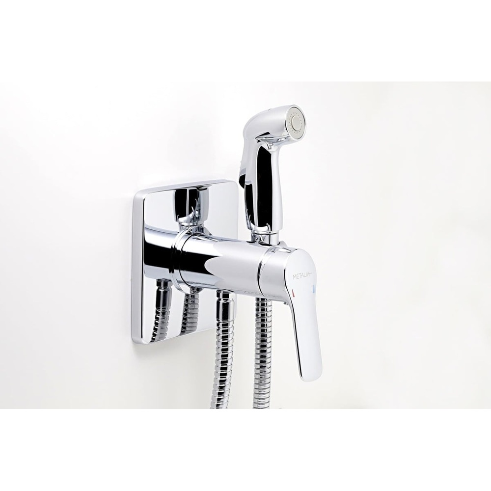 Mitigeur bidet encastré avec support de douchette, flexible métallique de 150 cm et douchette équipée d’une vanne STOP.