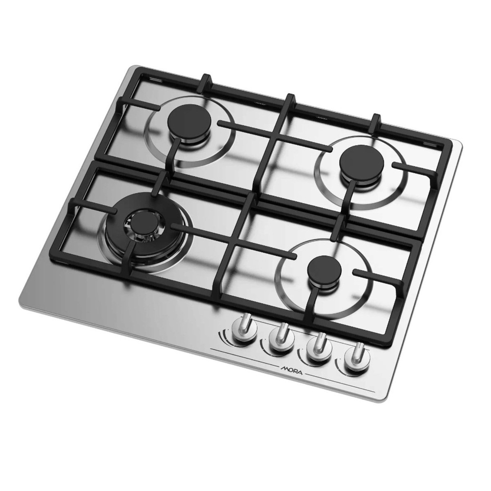 Cuisinière à gaz Mora d'une largeur de 59 cm et de couleur Acier inoxydable. Le nombre de plaques de cuisson est de 4 et la tension d'alimentation (VOVO) : 220-240.