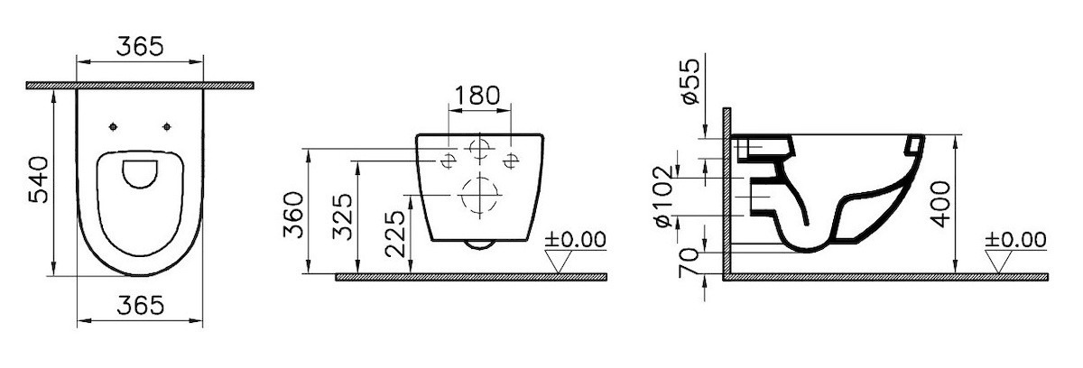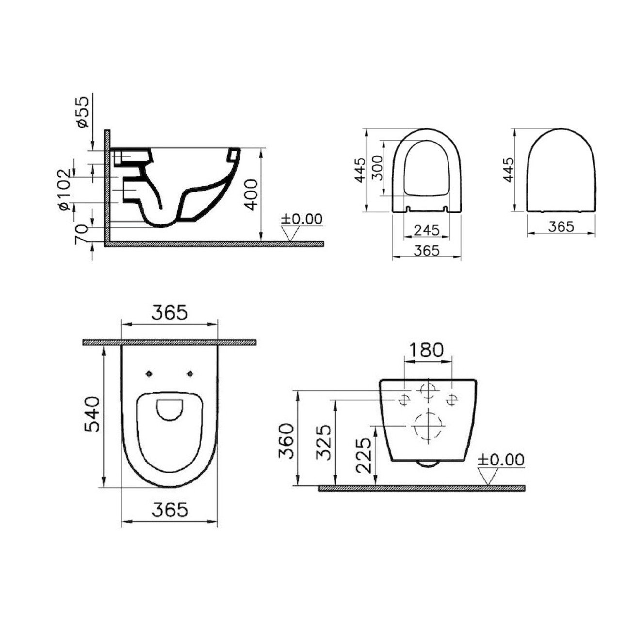 Caractéristiques de la Cuvette RIM-EX (sans bride) et abattant ultra-fin avec frein de chute , Vitra Sento (7748B003-0075 + 120-003R009) :
