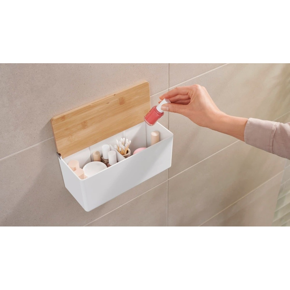 Pas besoin de percer lors de l’installation : tout est assuré par le système adhésif. La boîte murale de rangement tesa® Baboo, en taille moyenne et équipée d’une cloison pratique, est idéale pour organiser vos bijoux, produits cosmétiques, cotons-tiges et autres accessoires indispensables. Fabriquée en plastique blanc mat de haute qualité avec un couvercle en bambou naturel, elle s’intègre parfaitement dans tous les styles de salle de bains.