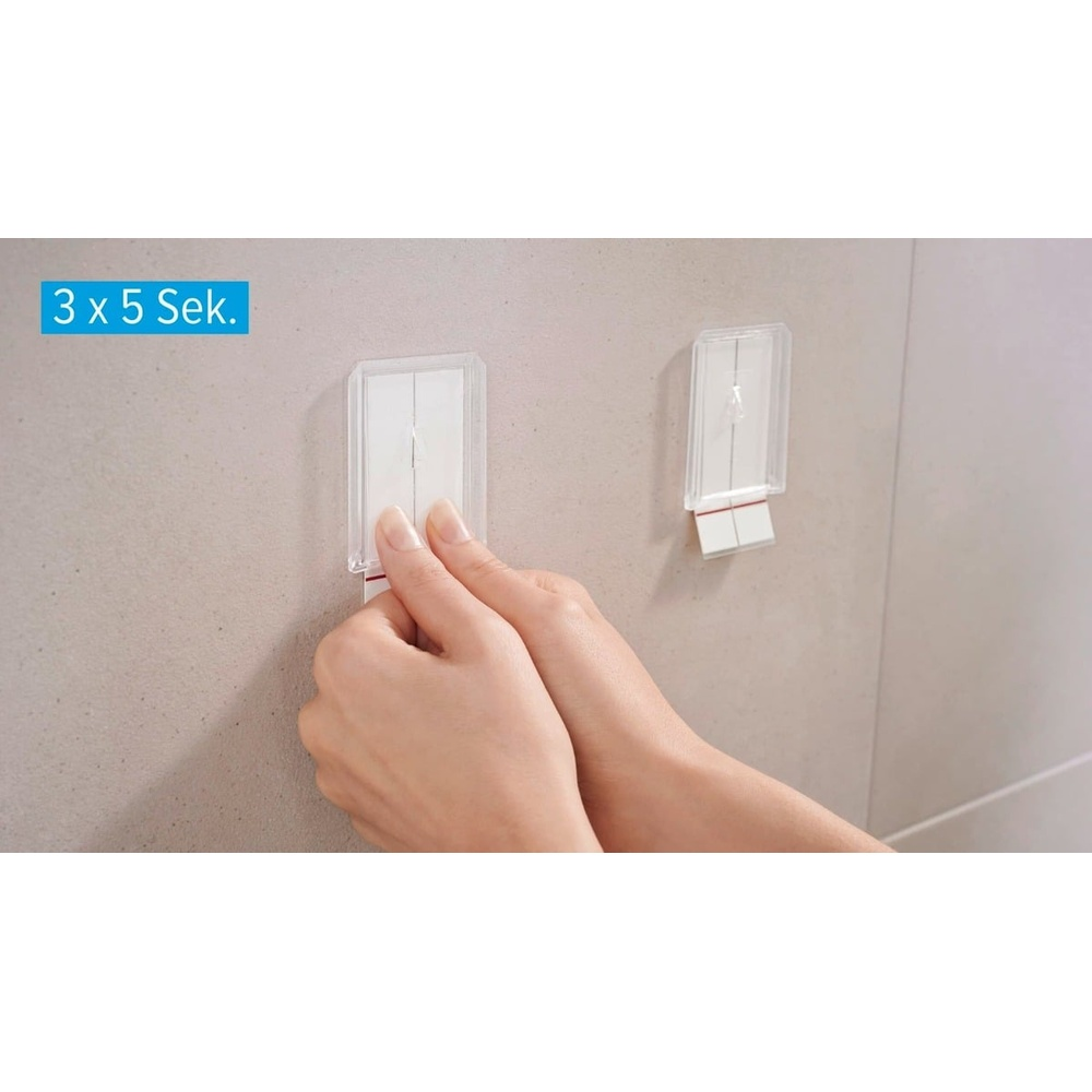 L’installation est très simple grâce aux bandes adhésives tesa® Powerstrips Waterproof, qui offrent une solution résistante à l’eau et supportant jusqu’à 3 kg de charge. Les bandes se retirent facilement sans laisser de traces. Les boîtes de rangement tesa® Baboo sont disponibles en différentes tailles et peuvent être combinées pour créer des ensembles personnalisés. Après démontage, la boîte peut être réinstallée avec de nouvelles bandes tesa® Powerstrips Waterproof XL.