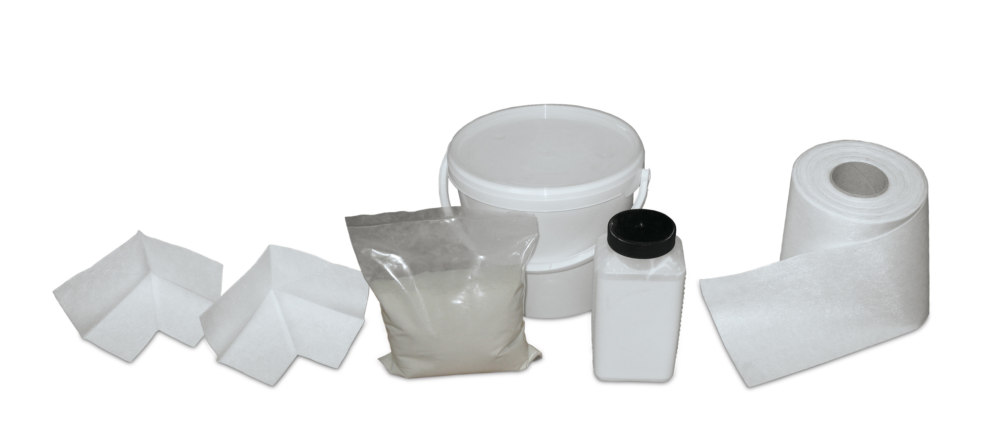 - Kit d’étanchéité composé d’une bande d’étanchéité de 10 m, 2 angles, une poudre et un liquide à mélanger pour le collage
