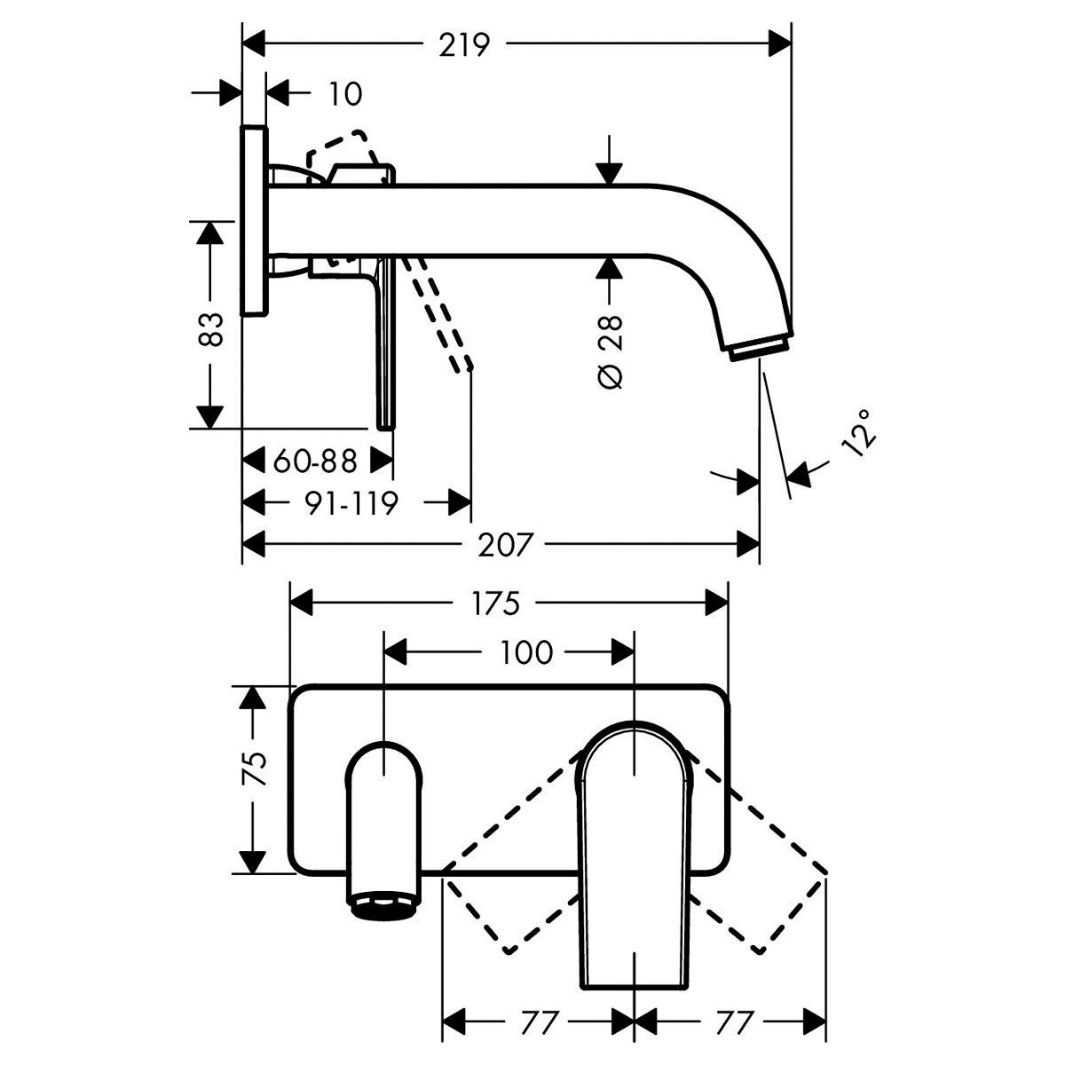 Caractéristiques du Mitigeur de lavabo encastré mural, 2 sorties, bec 207 mm, Noir mat, Hansgrohe Vernis Shape (71578670) :